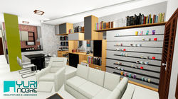 Descrição: Neste projeto uma casa térrea com duas suítes deveria ser totalmente ambientada e alguns temas de gosto da cliente deveriam ser aproveitados como: filmes, séries, música e jogos eletrônicos. Chegamos a um resultado que agradou à cliente e a nós autores do projeto, que acabou por ser bem sucedido em converter uma casa simples num ambiente agradável e excelente para receber os amigos ou mesmo relaxar depois de um cansativo dia de trabalho. Como principal intervenção podemos citar a área social, onde foi proposto de um lado um grande armário que abrigará uma coleção de bebidas e canecas, além de acessórios diversos, no outro um grande painel para TV que tem continuidade no corredor permeado por quadros com diversos dos temas já citados. Nos quartos e demais ambientes procuramos manter uma coerência na linguagem de materiais e cores em tons de branco, preto, cinza e madeirado.